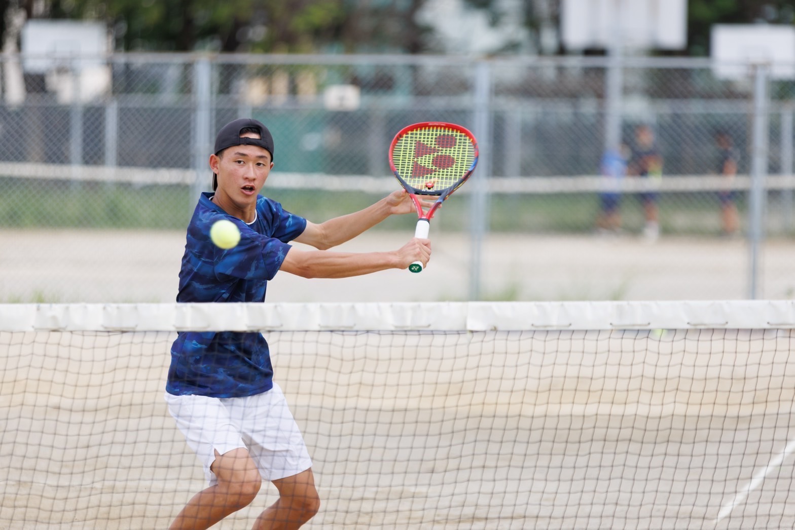 ▲タイでの試合中バックハンドのリターンを打っているところです。