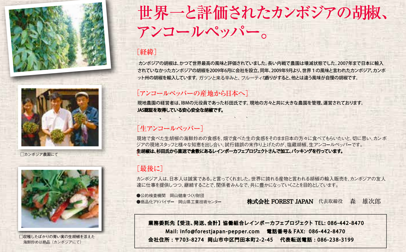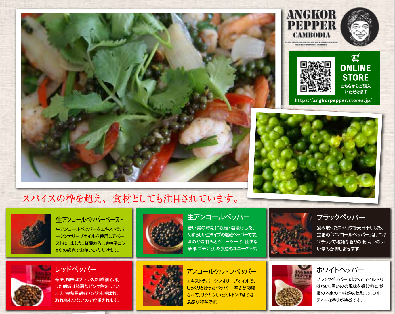 2007年まで日本に輸入 されていなかったカンボジアの「クメール種の胡椒」は、他の種より、軸からの長さが短く、風味、味がより豊かになっているのが特徴です。ガツンと来る辛みと、フルーティな香りが自慢で、3つ星取得のレストランで採用されるなど、多くのお客様に好評価をいただいています。